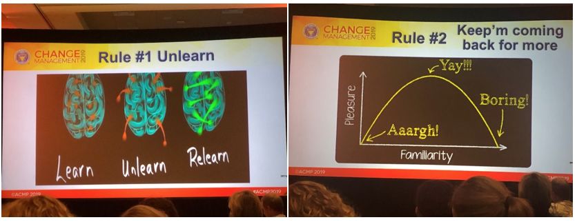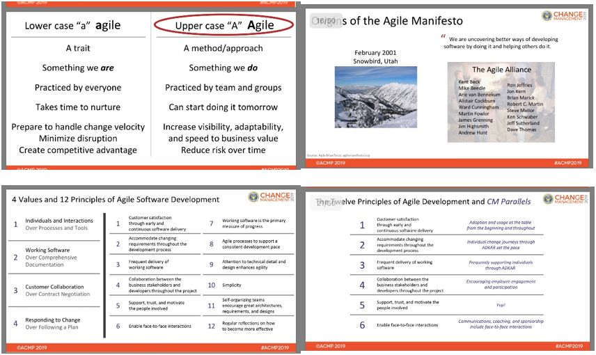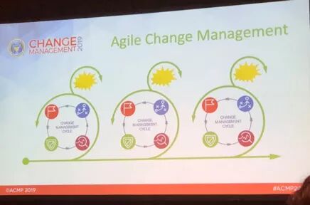 第二场《How to win at the intersection of Agile and Change Management 》是由业内大佬Prosci的Tim讲的。很高兴他们作为业界领先者已经开始实践并总结经验。三年前当变革管理行业标准面世的时候,隐隐担忧这样的标准会不会进一步加剧变革管理实践的僵化。去年与敏捷宣言作者Arie van Bennekum的深入学习与合作让自己更加理解了敏捷的宗旨与价值观。所以在听了Tim的分享后,一颗心算是放下来了:真正有价值的实践终于开始了。
