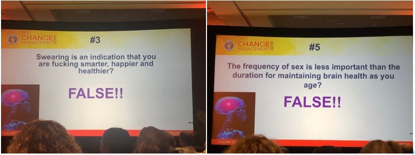 从主题层面来看,继往年的教练技术的应用、组织文化的视觉呈现、立体沟通策略的搭建、变革管理的KPI/ROI等话题,今年大会的关注点在敏捷与变革管理的融合与连接。不同往年的零星对话,这次单只今天就有两场嘉宾分享专门研讨这一主题。第一个主题是《Be Agile-Driving Change in the Fast Lane》。三个嘉宾来自不同国家。嘉宾一句:“为什么很多变革管理从业者不赞同使用敏捷呢?因为这会要求他们自己也改变……”这话说得很有趣。后来午餐的时候跟这位分享嘉宾聊起来,我告诉她:其实很多人反对这论调,也有可能就是因为他们并不真正懂得敏捷。